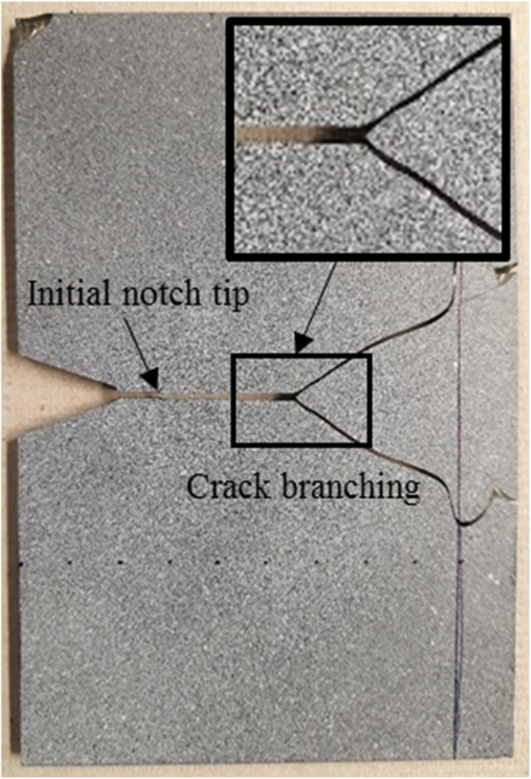 Crack branching in soda-lime glass with a pre-notch under external force in the outward vertical direction